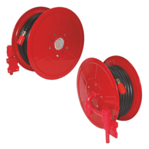 This fire hose reel can pivot or swing horizontally, allowing better access and maneuverability during use.